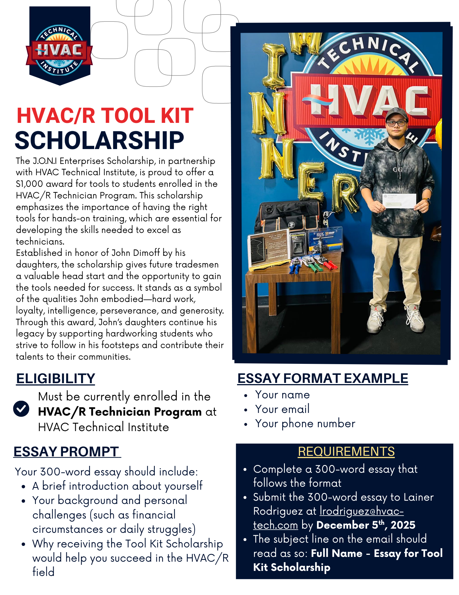 Complete a 300-Word essay which include an intro about yourself, your background and personal challenges, and why this tool kit will help you succeed in the HVAC/R field. Applicants should email their essay to lrodriguez@hvac-tech.com. Please make sure to add your full name and essay for tool kit scholarship to the email subject line.