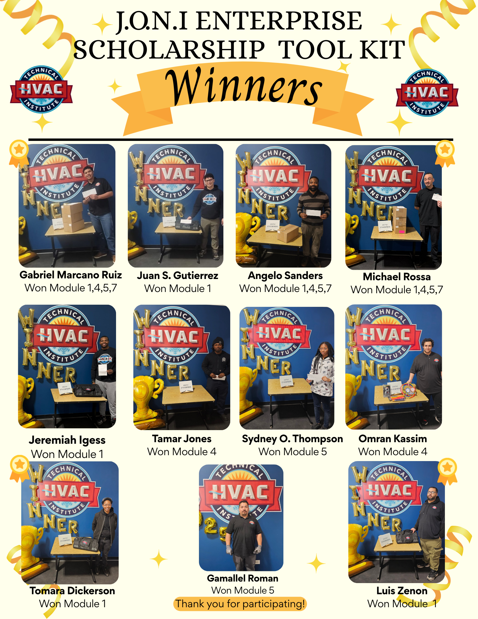J.O.N.I Enterprises & HVAC Technical Institute are proud to offer a $1,000.00 tools scholarship for current students in our HVAC/R program. This scholarship emphasizes the importance of having the right tools which are essential to develop the skills needed as technicians.