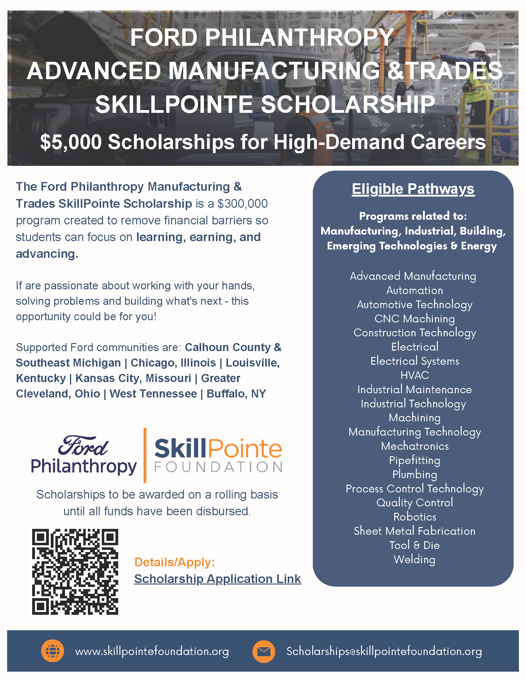 The SkillPointe Foundation is awarding multiple $1,000 scholarships every quarter for individuals pursuing technical/vocational training in construction, healthcare, energy, manufacturing, transportation, and other fields.